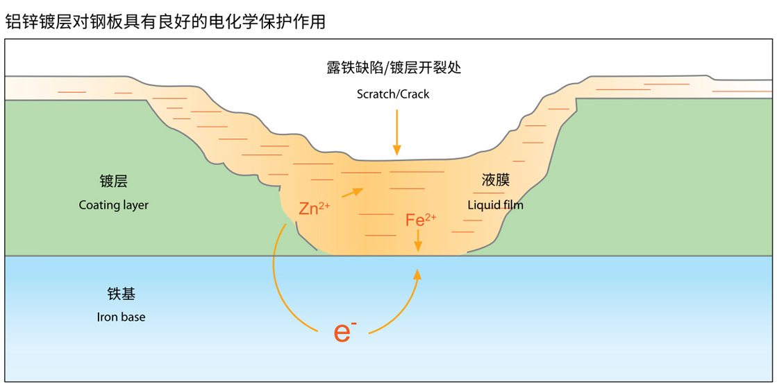熱鍍鋁鋅鋼板是以各種強(qiáng)度和厚度規(guī)格的冷軋鋼板為基材,在雙面熱鍍一層Al-Zn鍍層所得到的預(yù)鍍層鋼板,鍍層成分中質(zhì)量百分比約為55%Al、1.6%Si、43.4%Zn。融合了鋁的物理保護(hù)和高耐久性以及鋅的電化學(xué)保護(hù)特性。此外,在表面呈具有高裝飾性的光亮銀灰色澤及規(guī)則的花紋,并具有浮凸感。