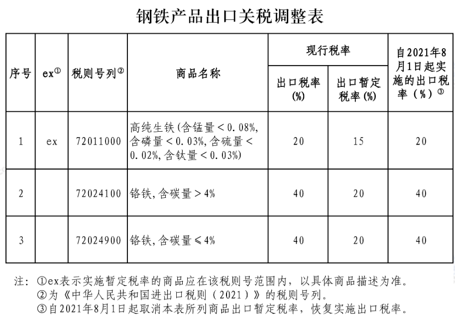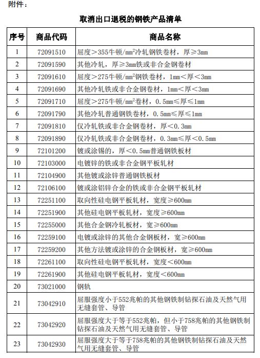 香港萬得通訊社報道,財政部發(fā)布《關于取消鋼鐵產品出口退稅的公告》表示,自2021年8月1日起,取消本公告所附清單列示的鋼鐵產品出口退稅。具體執(zhí)行時間,以出口貨物報關單上注明的出口日期界定。